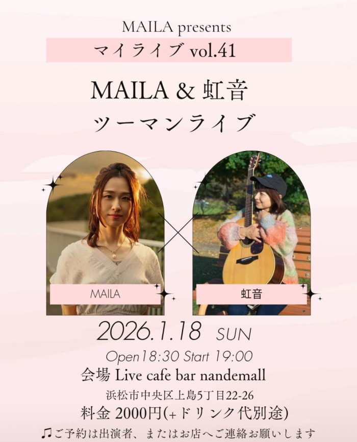 | 1月18日(日) | 7:00pm~ | MAILA Presents マイライブ Vol.41 MAILA & 虹音 ツーマンライブ 開場18:30 開演19:00 料金¥2000(ドリンク別途注文要) |
