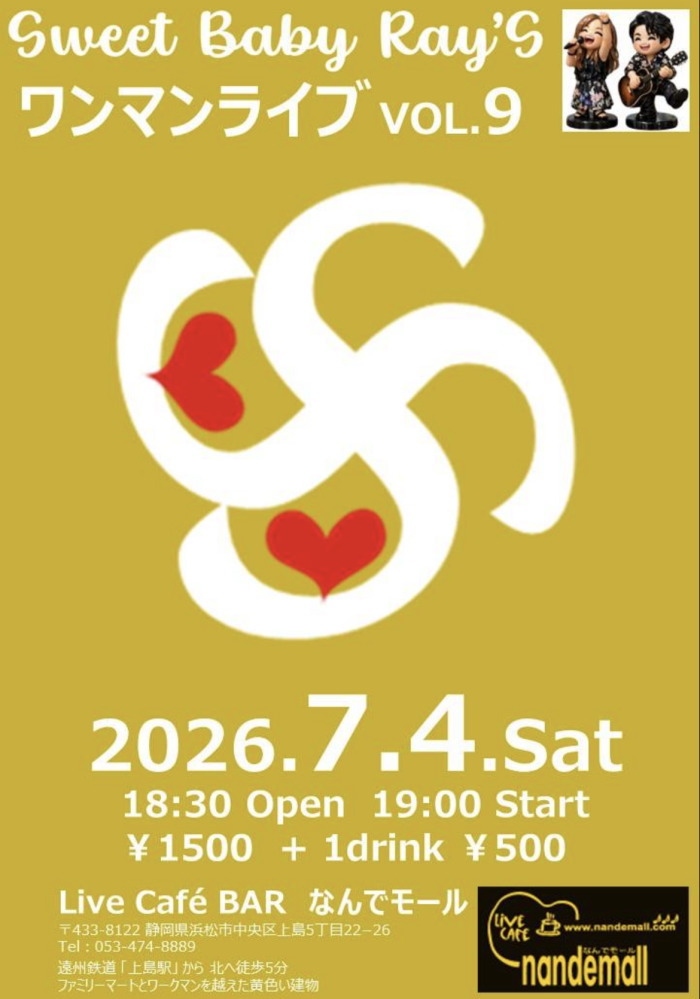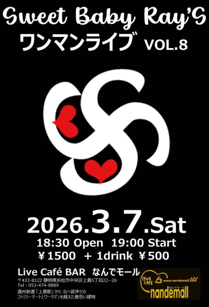 | 3月7日(土) | 7:00pm~ | Sweet Baby Ray's ワンマンライブ(120分)Vol.8 開場18:30 開演19:00 料金¥1500(ドリンク別途注文要) |
