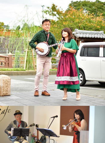 Profile 静岡県掛川市在住 富塚章(ギター・バンジョー・ピアノ)と太田くみ(トランペット・ヴォーカル)の音楽ユニット つま恋リゾート彩の郷 BAR ラウンジのJARDINにてレギュラー出演中 浜松市のやらまいかミュージックフェスティバルや掛川市の大門音楽祭などにも多数参加。カフェやライブハウス、ホテルなどでも活動しています。外のイベントでは明るく楽しいバンジョーとトランペットで盛り上、時には歩きながらの演奏も。室内では静かにBGMなども JAZZから歌謡曲、ポップス、クラシック、オリジナル曲、ご当地ソングまで300曲以上のレパートリーがあります。一人でいくつかの楽器をこなすので、二人だけのユニットながら様々な演奏スタイルやジャンルをこなすことができます。 富塚章 Akira Tomizuka(Guitar・Banjo・Piano・Vocal etc.) 東京都生まれ掛川市在住 中学の頃より当時としては珍しかった登校拒否児。 なんとか音楽の専門学校にもぐり込み、そこで勉強の楽しさに目覚め、二十歳を過ぎてプロミュージシャンの道を歩みだし、数多くの歌手のサポートを務める。 中国語やハングル語に訳された「ザ・ジャズギター」や、音楽大学の教科書に採用された「初めてのジャズ」「はじめてのジャズボーカル」など数多くの著書がある。静岡県掛川市にて音楽教室も運営している。HPはこちら→富塚章ギター・ピアノ教室 太田くみ Kumi Ota (Trumpet・Vocal・etc.) 宮城県仙台市出身掛川市在住 小学4年生で友人に誘われトランペットクラブに入部。中学、高校と吹奏楽部一筋に励む。高校を卒業後就職、結婚、二人の娘を育てるため育児に専念。長女が吹奏楽部でトランペットを吹いたり、次女がギターの弾き語りをはじめ、少しずつ音楽の楽しさを思い出してきたところにあることがきっかけで20数年のブランクのあとトランペットを再開。富塚章氏に師事。 トランペットの柔らかな音色には定評があり、JAZZや歌謡曲、ヨーデルなど様々なジャンルのボーカルをこなし、トランペット&ボーカリストとして注目を浴びている TOMI & KUMI Youtube チャンネル 登録はこちら |