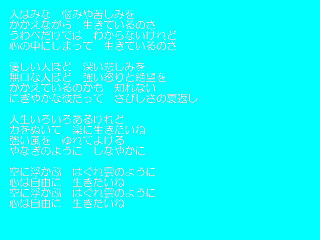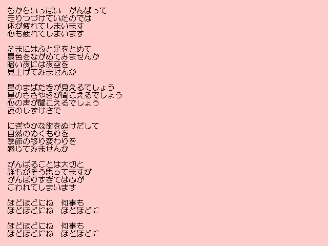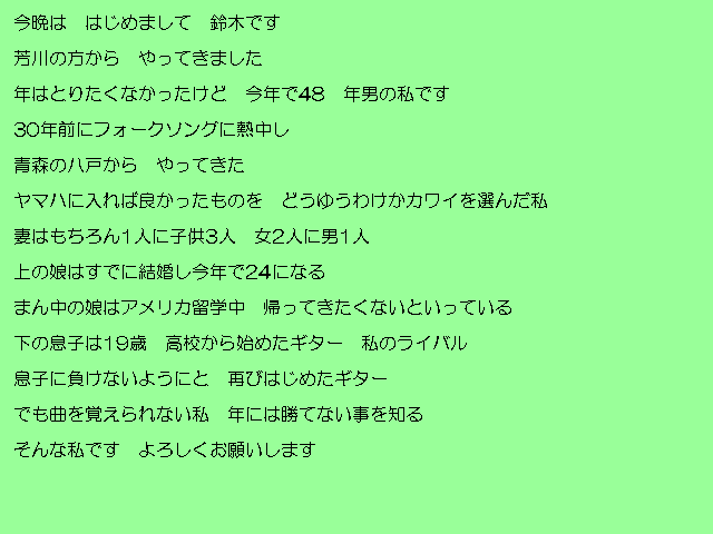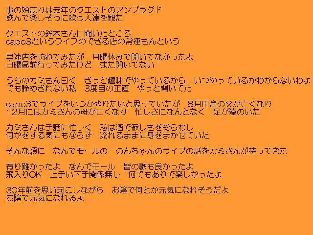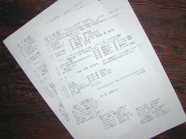 | 9/17 プログラム なんでモールで発表したオリジナル曲 「自己紹介」 「なんでモールに来るまで」 「はぐれ雲」 「ほどほどにね」 「信頼」 「無題」 |