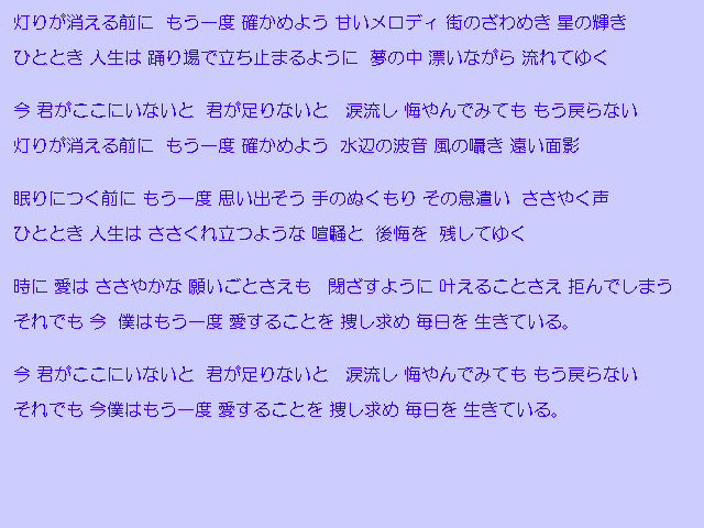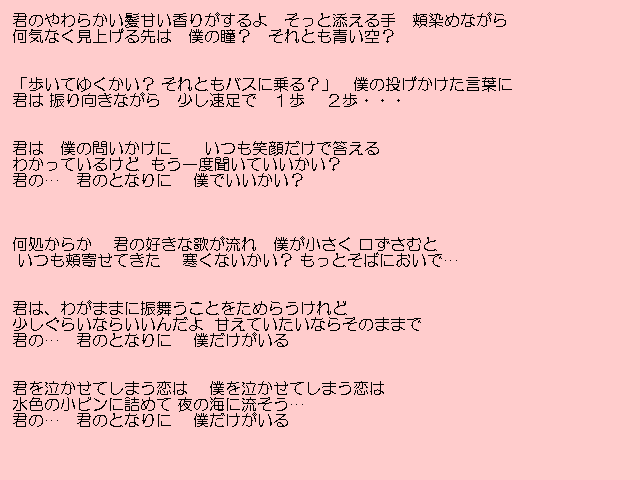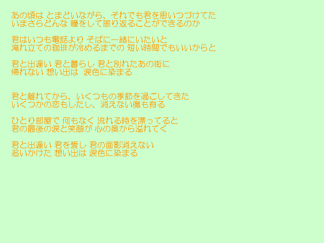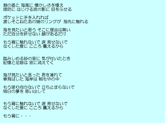 | 「灯りが消える前に」 詩:COACH 曲:COACH 「涙色の街」 詩:COACH 曲:COACH 「海の記憶」 詩:COACH 曲:COACH 「Mellow」 詩:COACH 曲:野末浩 |