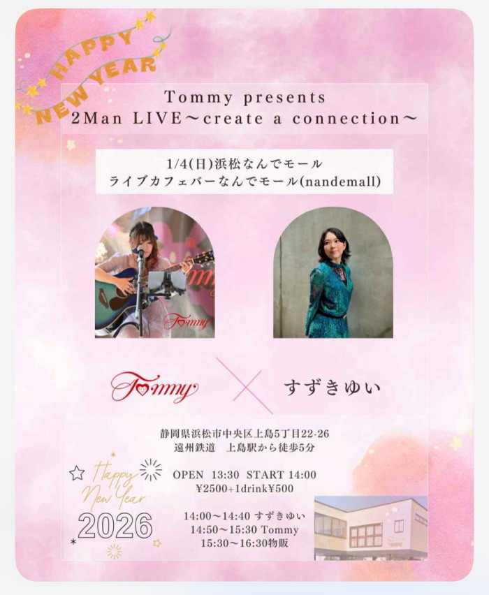 | 1月4日(日) | 2:00pm~ | Tommy Presents 2Man LIVE~create a connection~ すずきゆい Tommy 開場13:30 開演14:00 料金¥2500(ドリンク別途注文要) |