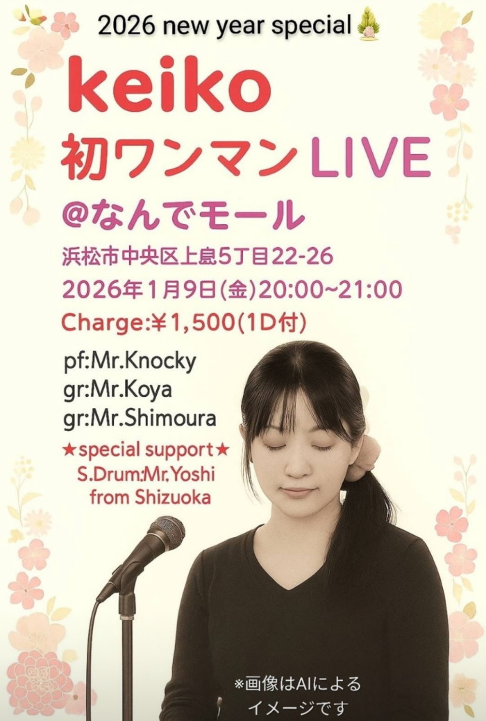 | 1月9日(金) | 8:00pm~ | keiko ワンマンライブ (60分)Vol.1 開場19:30 開演20:00 料金¥1500(1D込) |