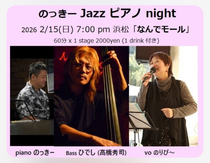 | 2月15日(日) | 7:00pm~ | のっきー JAZZ ピアノ night piano:のっきー bass:ひでし vo:のりぴ~ 開場18:30 開演19:00 料金¥2000(1D込) |