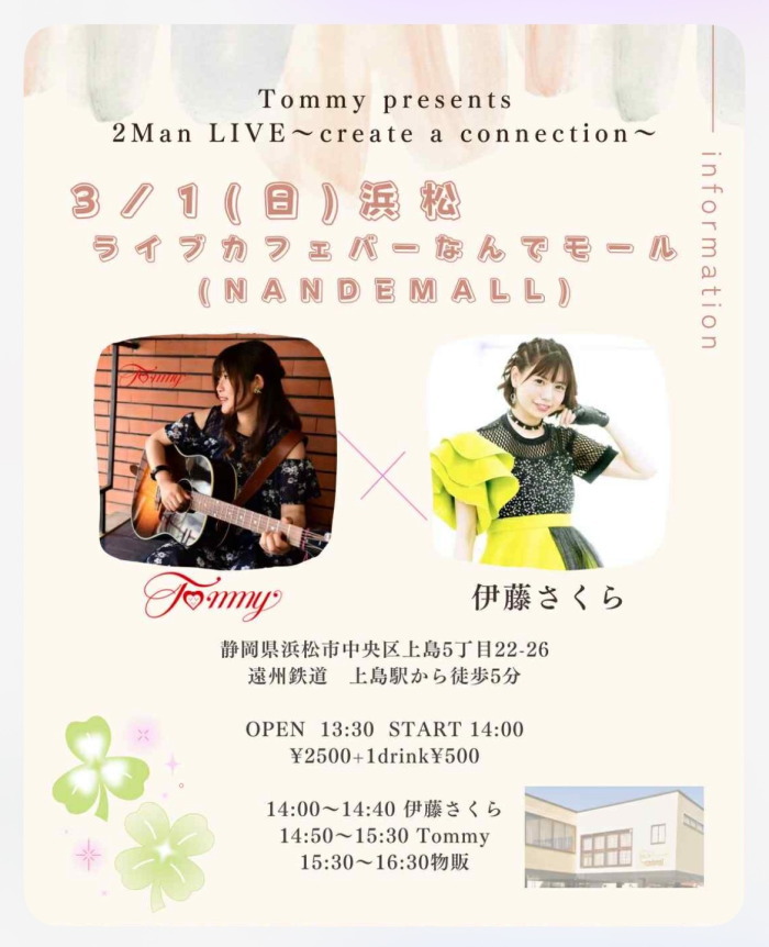 | 3月1日(日) | 2:00pm~ | Tommy Presents 2Man LIVE~create a connection~ 伊藤さくら Tommy 開場13:30 開演14:00 料金¥2500(ドリンク別途注文要) |