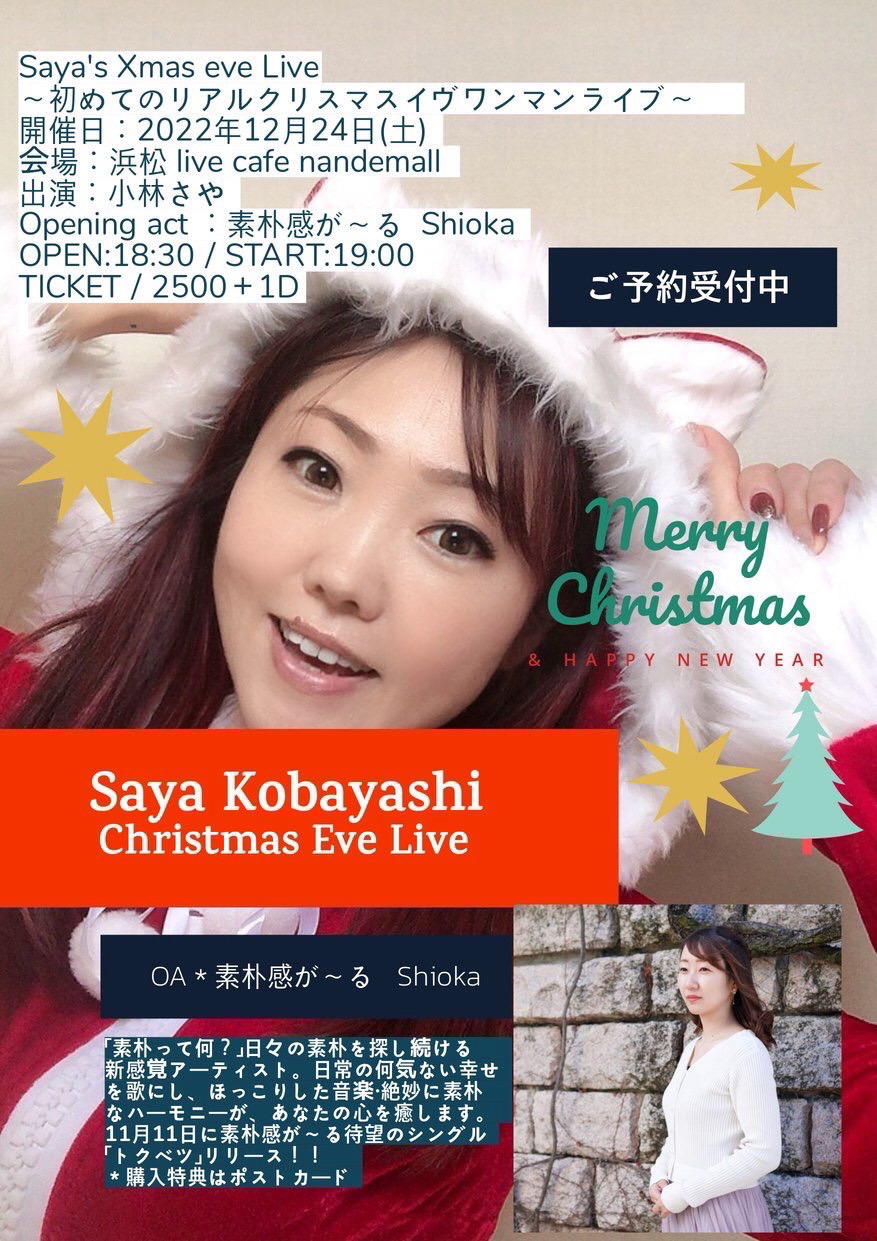 | 12月24日(土) | 7:00pm~ | Saya's Presents Saya's Xmas eve Live ~初めてのリアルクリスマスイヴワンマンライブ~ 出演:小林さや OA:素朴感が~る Shioka 開場18:30 開演19:00 料金¥2500(ドリンク別途注文要) |