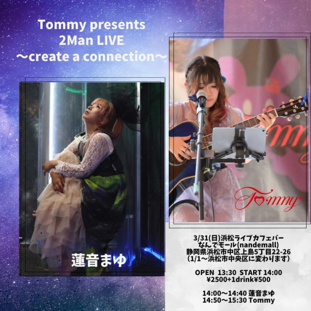 | 3月31日(日) | 2:00pm~ | Tommy Presents 2Man LIVE~create a connection~ 蓮音まゆ Tommy 開場13:30 開演14:00 料金¥2500(ドリンク別途注文要) |