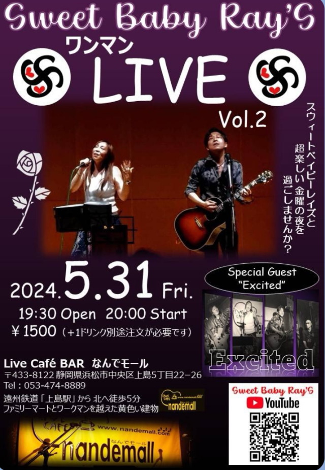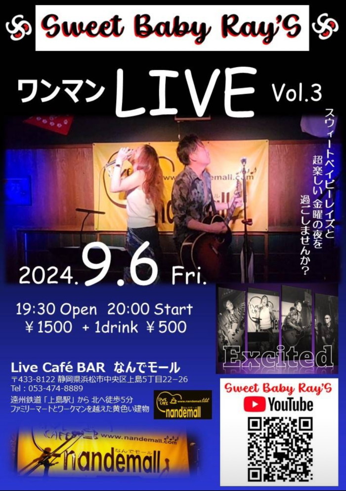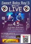 | 4月5日(金) | 8:00pm~ | Sweet Baby Ray's ワンマンライブ(70分)Vol.1 開場19:30 開演20:00 料金¥1500(ドリンク別途注文要) |