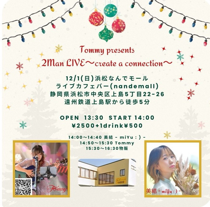 | 12月1日(日) | 2:00pm~ | Tommy Presents 2Man LIVE ~create a connection~ 美結 Tommy 開場13:30 開演14:00 料金¥2500(ドリンク別途注文要) |