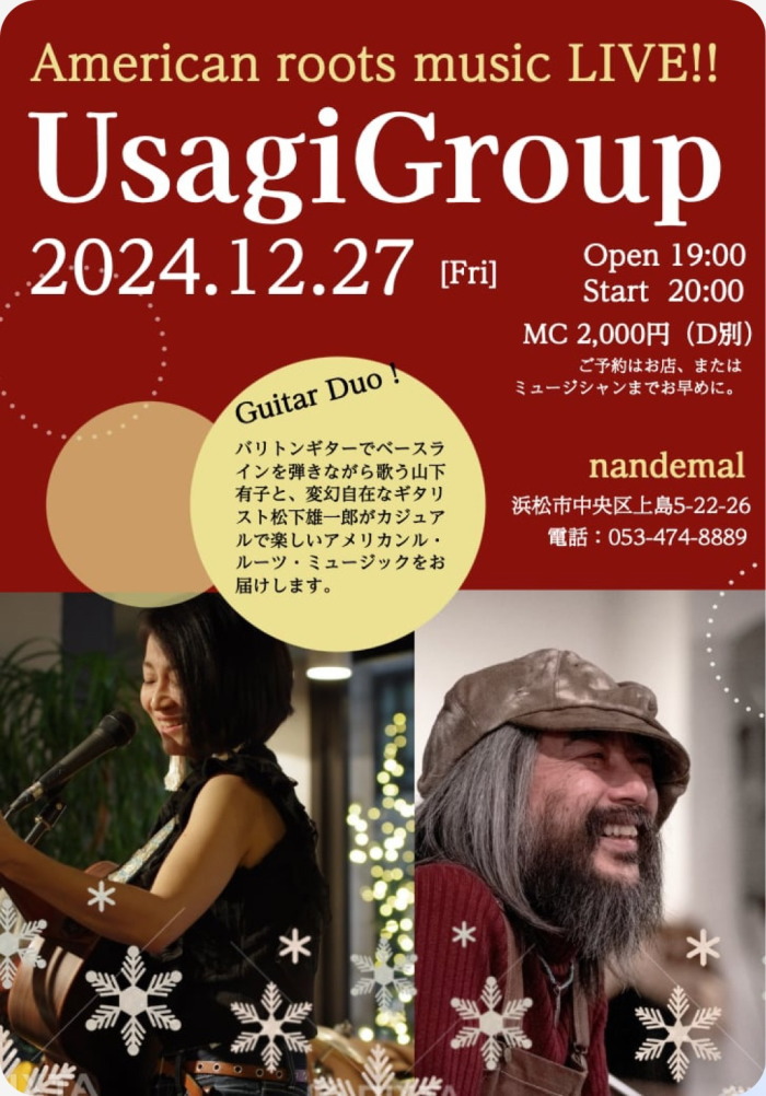 | 12月27日(金) | 8:00pm~ | Usagi Group ワンマンライブ (60分)Vol.1 開場19:30 開演20:00 料金¥2000 |
