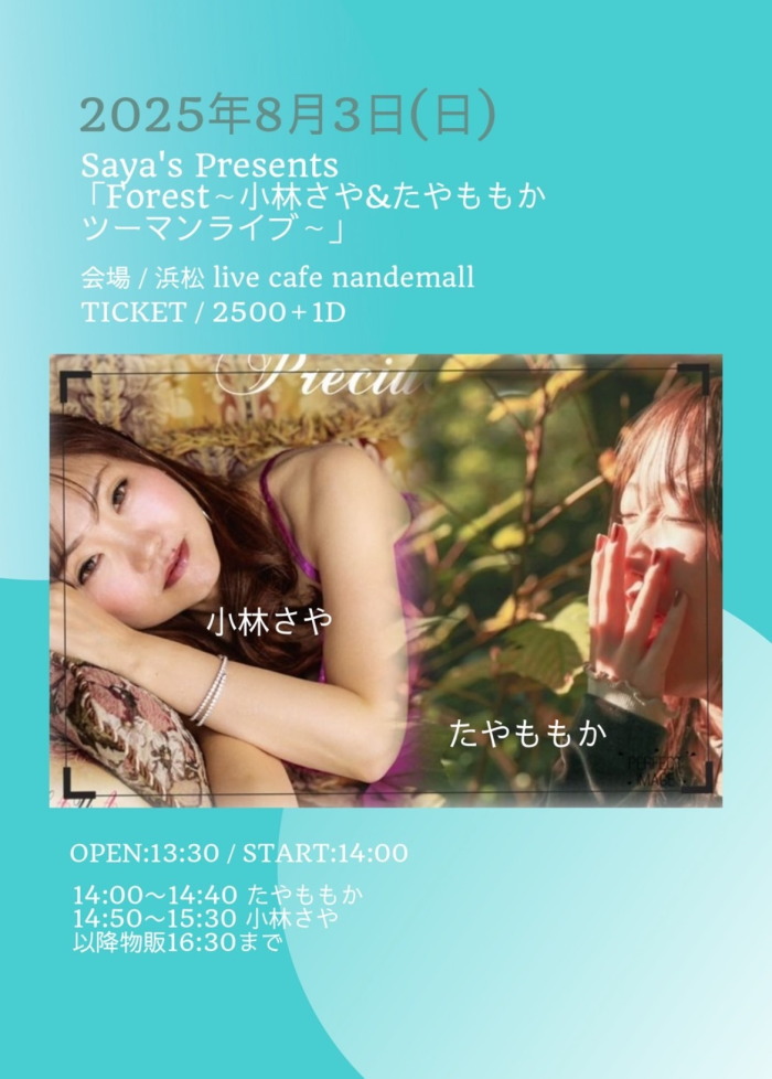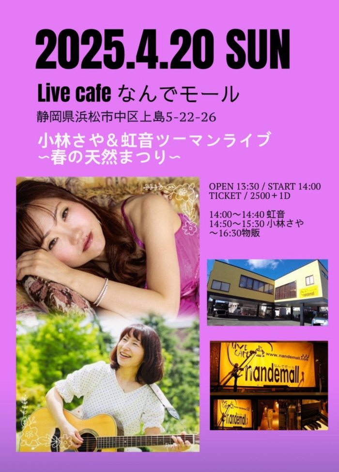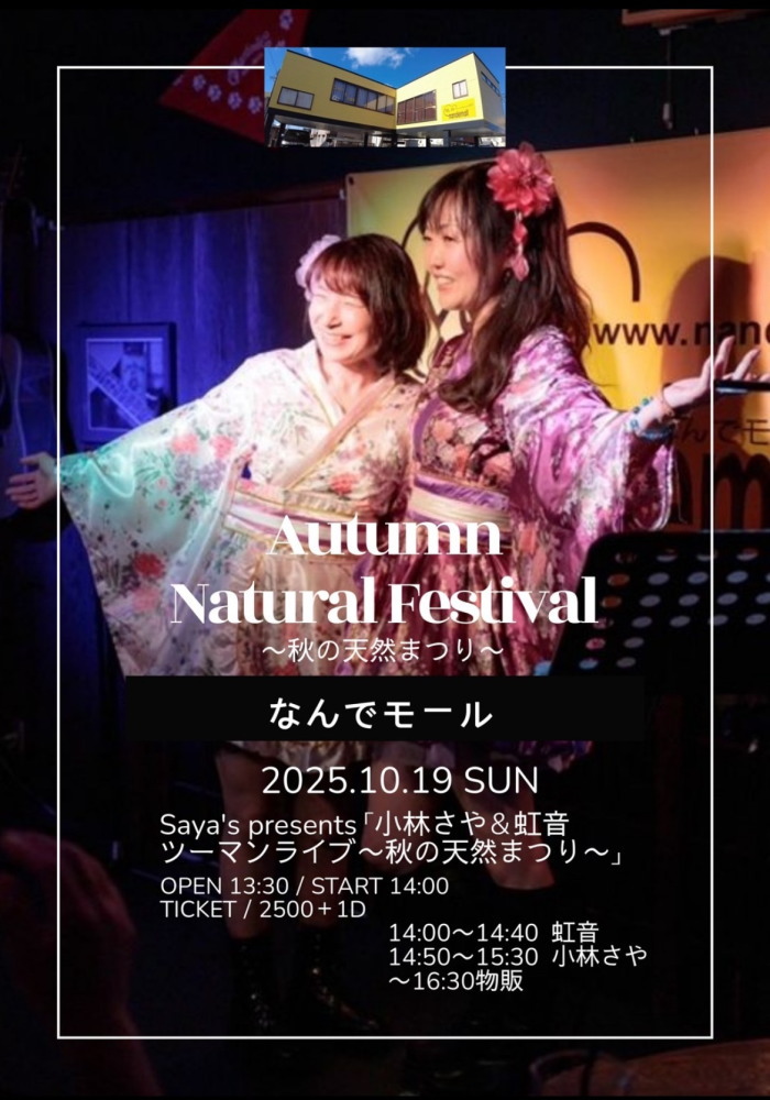 | 10月19日(日) | 2:00pm~ | Saya's Presents 小林さや&虹音ツーマンライブ 秋の天然まつり 開場13:30 開演14:00 料金¥2500(ドリンク別途注文要) |