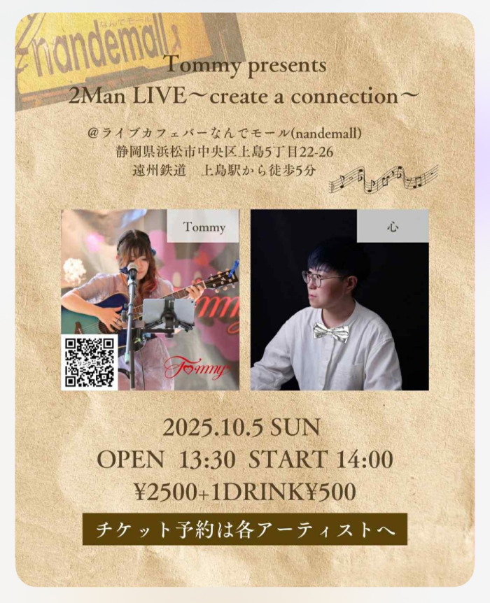 | 10月5日(日) | 2:00pm~ | Tommy Presents 2Man LIVE~create a connection~ 心 Tommy 開場13:30 開演14:00 料金¥2500(ドリンク別途注文要) |