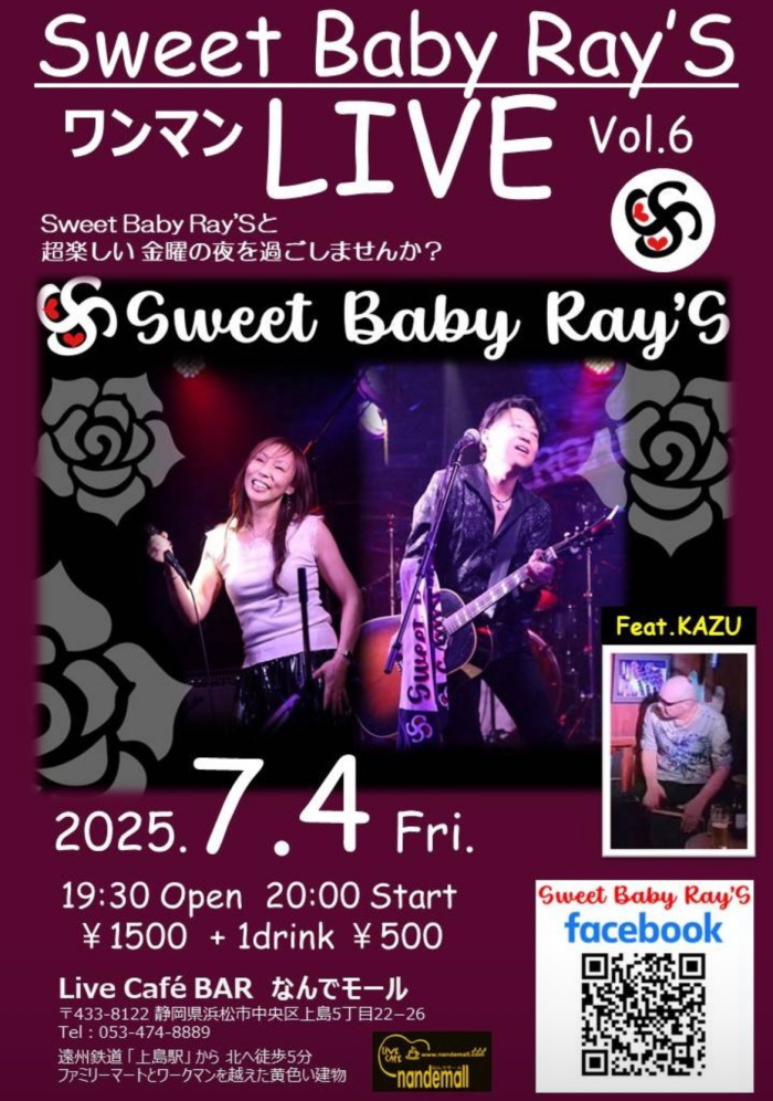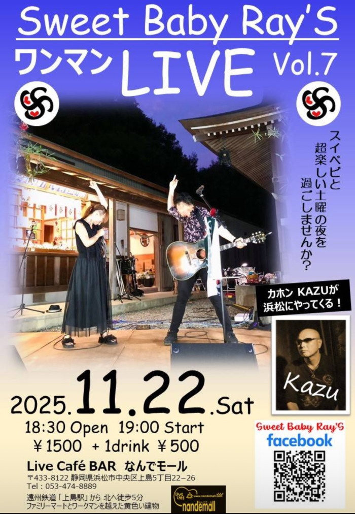 | 11月22日(土) | 7:00pm~ | Sweet Baby Ray's ワンマンライブ(120分)Vol.7 開場18:30 開演19:00 料金¥1500(ドリンク別途注文要) |