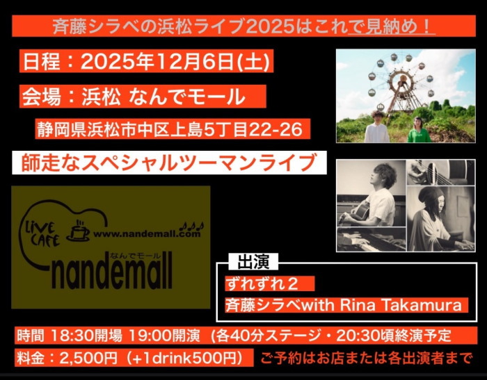 | 12月6日(土) | 7:00pm~ | 斉藤シラベ Presents 師走なスペシャルツーマンライブ ずれずれ2 斉藤シラベ with RinaTakamura 開場18:30 開演19:00 料金\2500(ドリンク別途注文要) |