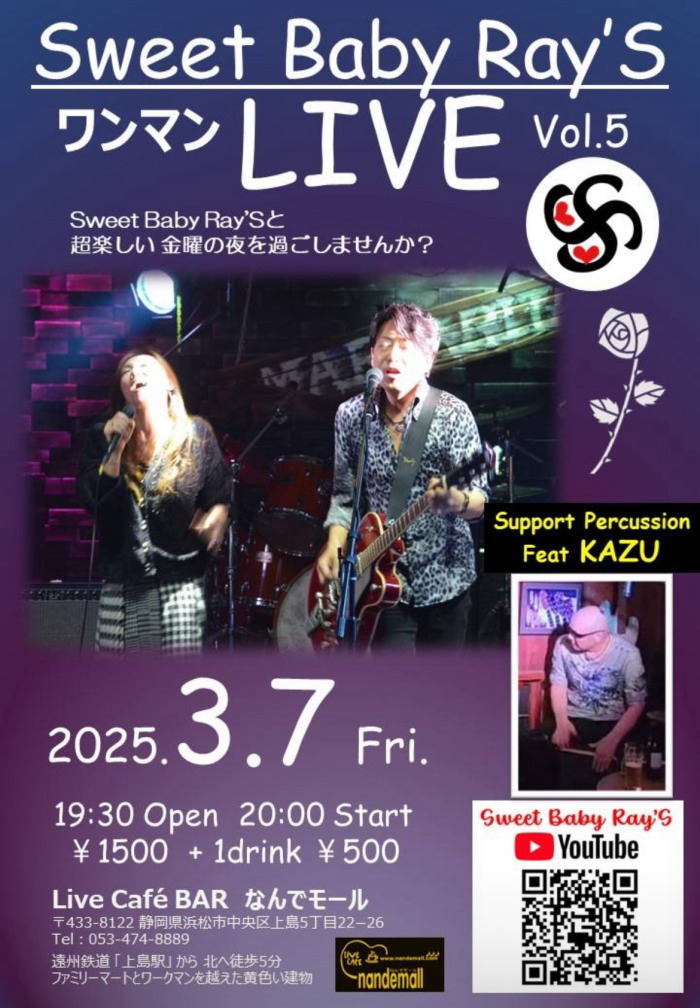 | 3月7日(金) | 8:00pm~ | Sweet Baby Ray's ワンマンライブ(70分)Vol.5 開場19:30 開演20:00 料金¥1500(ドリンク別途注文要) |