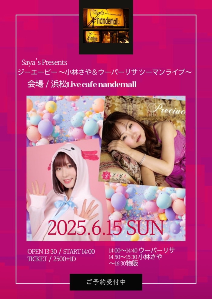 | 2月1日(土) | 7:00pm~ | Saya's Presents チョコっと早めのバレンタインライブ ウーパーリサ&小林さやツーマンライブ 開場18:30 開演19:00 料金¥2500(ドリンク別途注文要) |